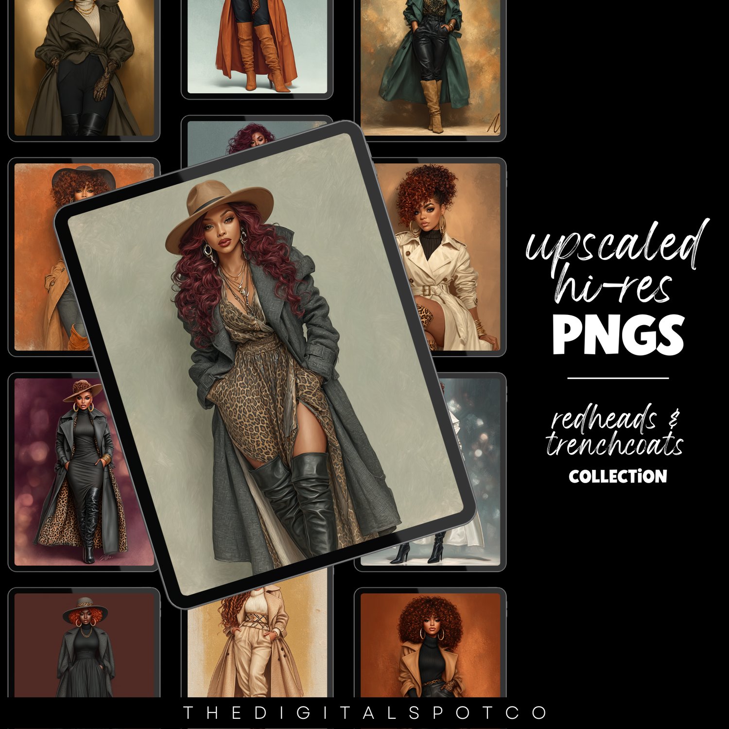 Redheads & Trench Coats PNG Bundle - 12 Unique AI-Generated Black Women - High-Res Artwork